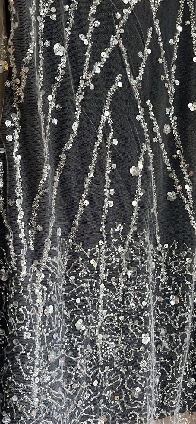 Take your New Year's Eve outfit to the next level with this exquisite embellished tulle, velvet dress. The white tulle is crusted in sequins, pearls and crystal like beads and layered on top of a gorgeous, soft, stretch Black Velvet fabric. Features an invisible zip in the side seam.