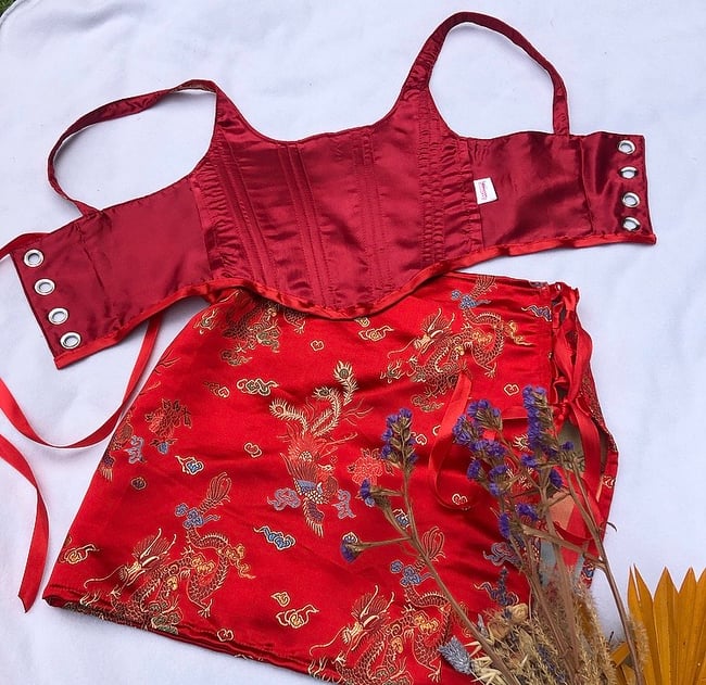 This set is sure to give your look a bold update. Featuring Chinese Dragon Brocade material with lace-up ribbon side split. Teamed with a boned corset that reverses into a faux silk satin corset top that matches your chosen colour. Corsets have a ribbon tie-up back allowing you to adjust it to your personal style and fit. The set comes with a matching scrunchie!