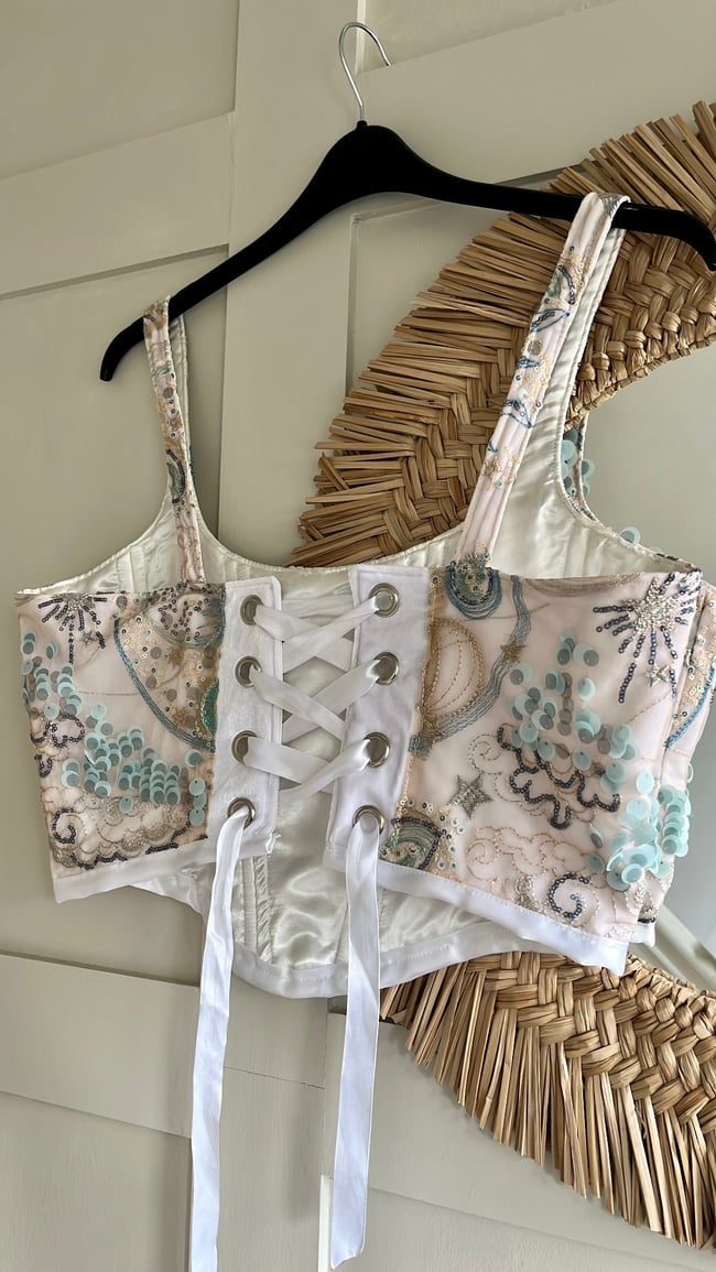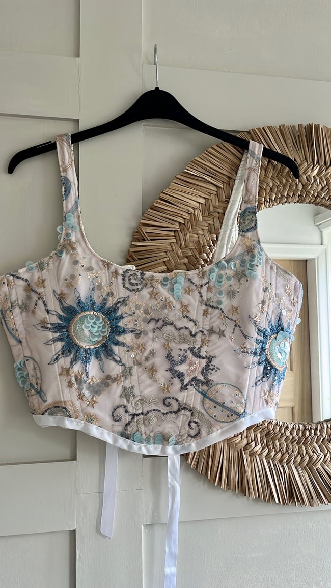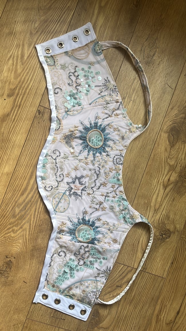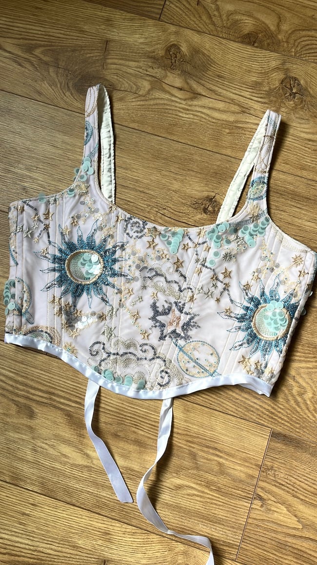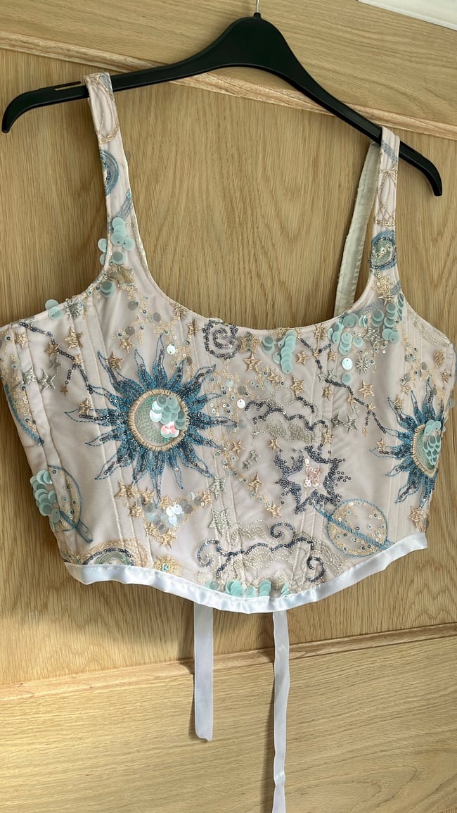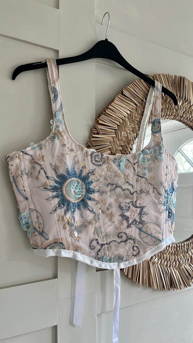 Take your outfit to the next level with this exquisite, heavily embellished tulle, velvet corset. The neutral tulle is embellished with sequins and metallic threads creating a Universe-like design with moons, stars, suns and planets that add a touch of cosmic glam. The tulle is layered on top of a gorgeous, soft, stretch white Velvet fabric. The corset features a lace up back allowing you to customise your size and fit