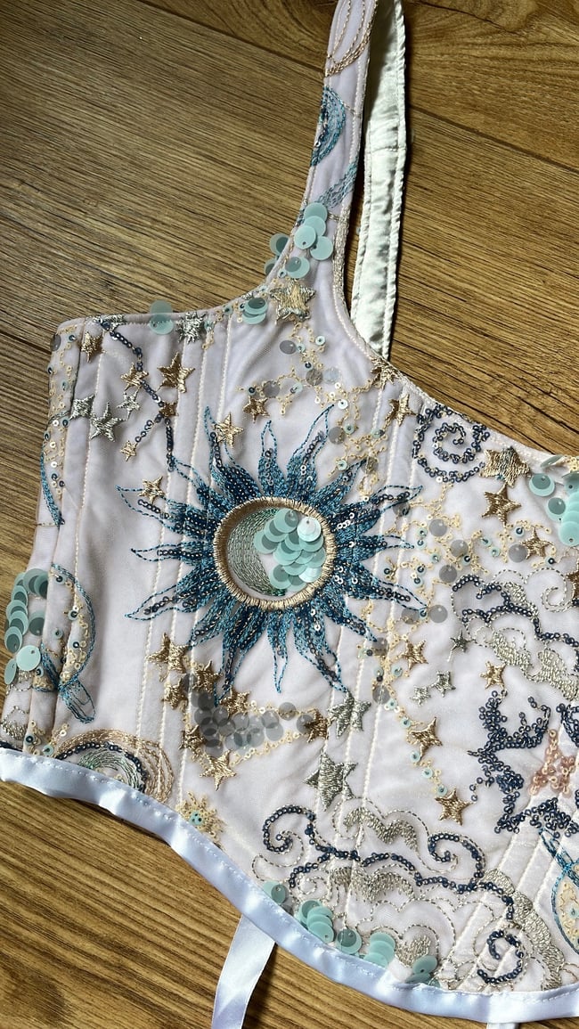 The Universe corset. Heavily embellished cosmic, star, sun and moon sequin corset in White